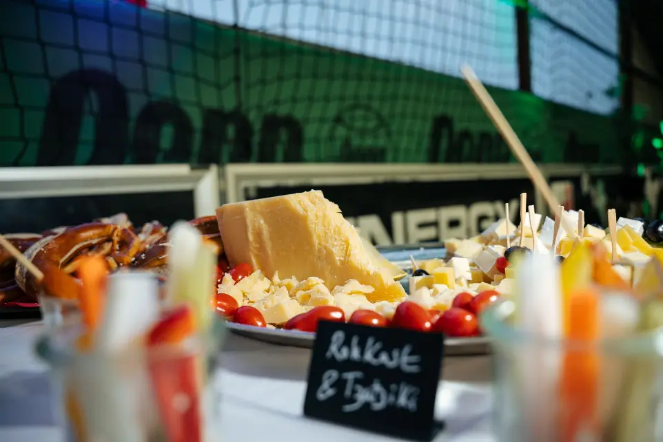 Buffet. DJ. Zwei Teams trinken und feiern getrennt.